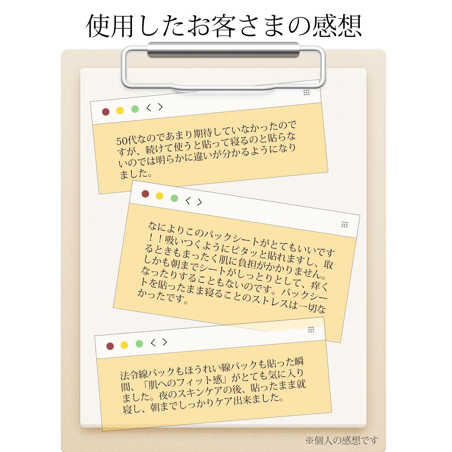 ●簡単手軽にシワケア 寝ている間に貼るだけの手軽さで、忙しい日常でも続けやすい!朝起きたとき、ふっくらとした肌を実感できます。